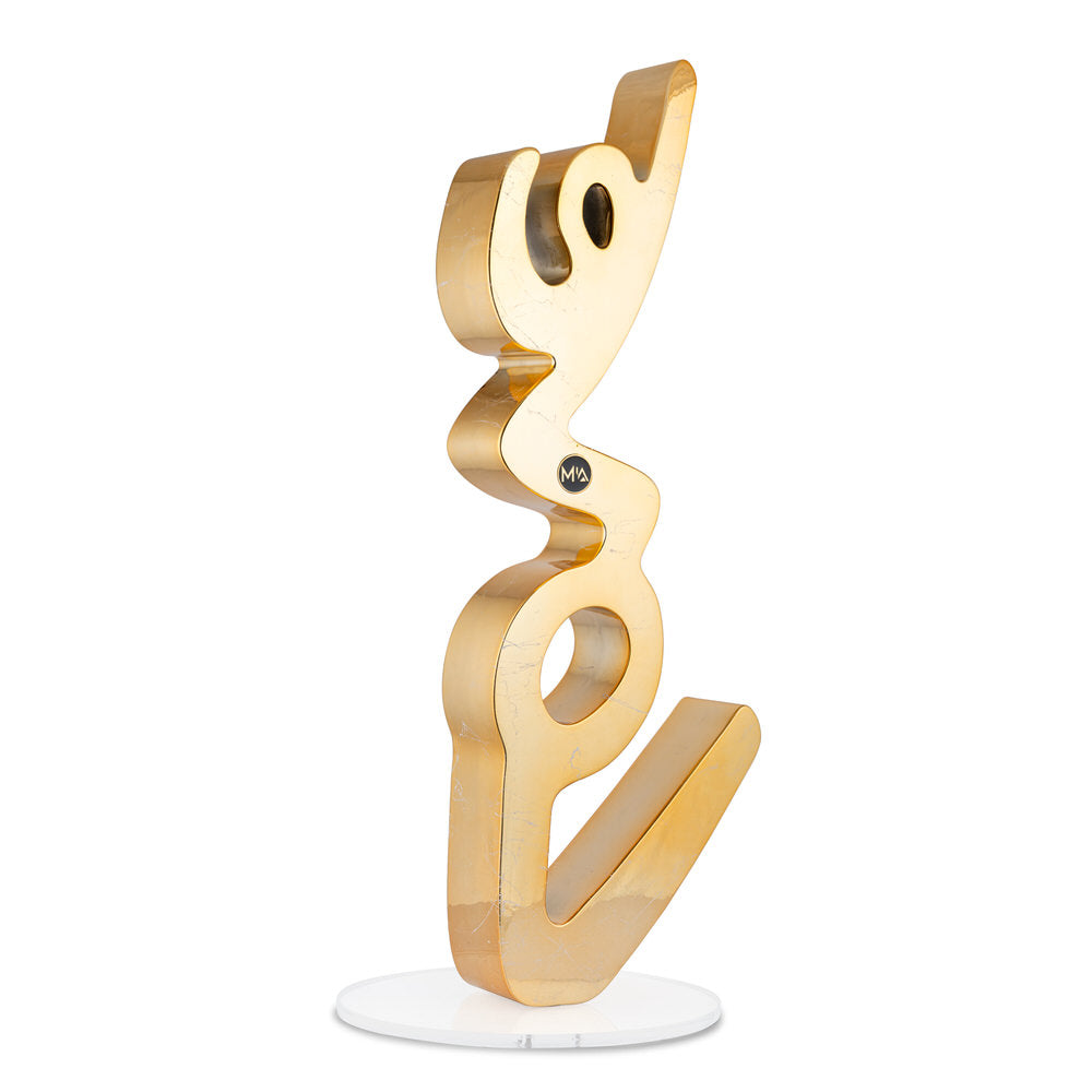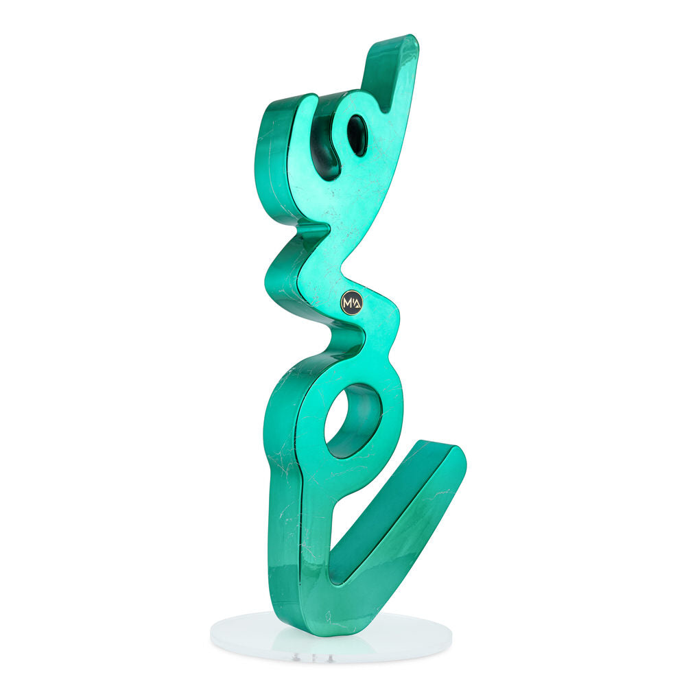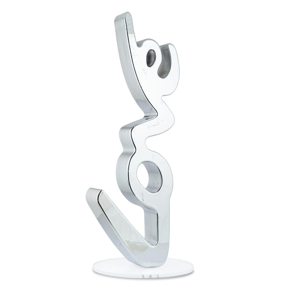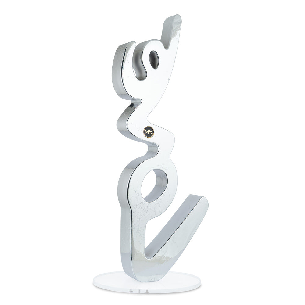 Realizzata in resina e polvere di marmo, con finitura metallizzata a specchio e venature effetto marmorizzato, è una scultura da appoggio che parla il linguaggio del design contemporaneo e dell’emozione autentica.