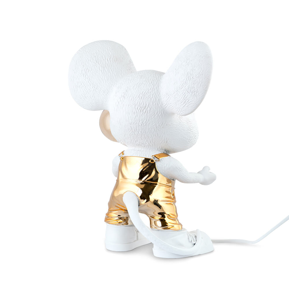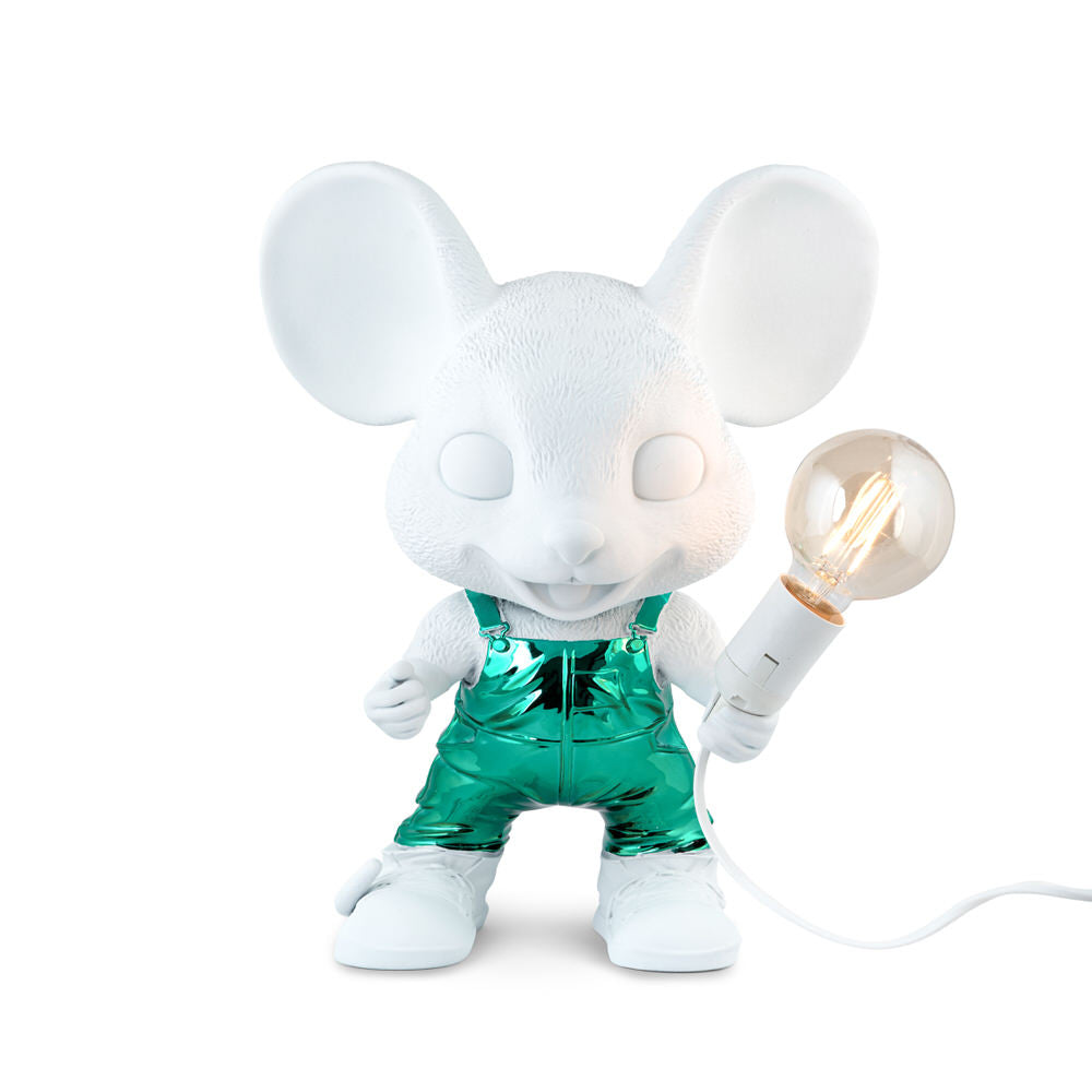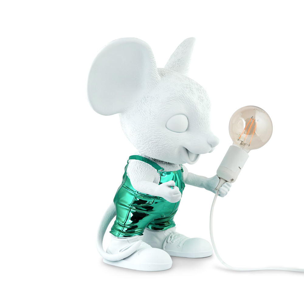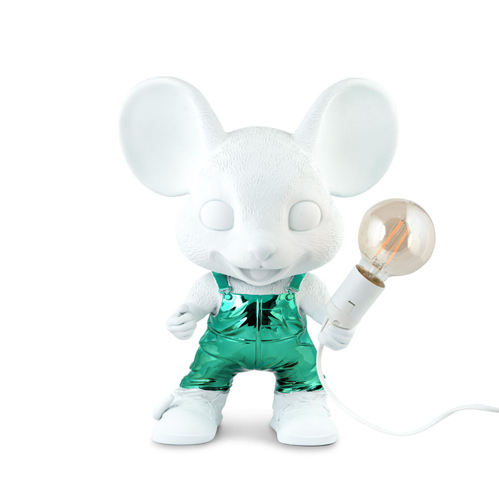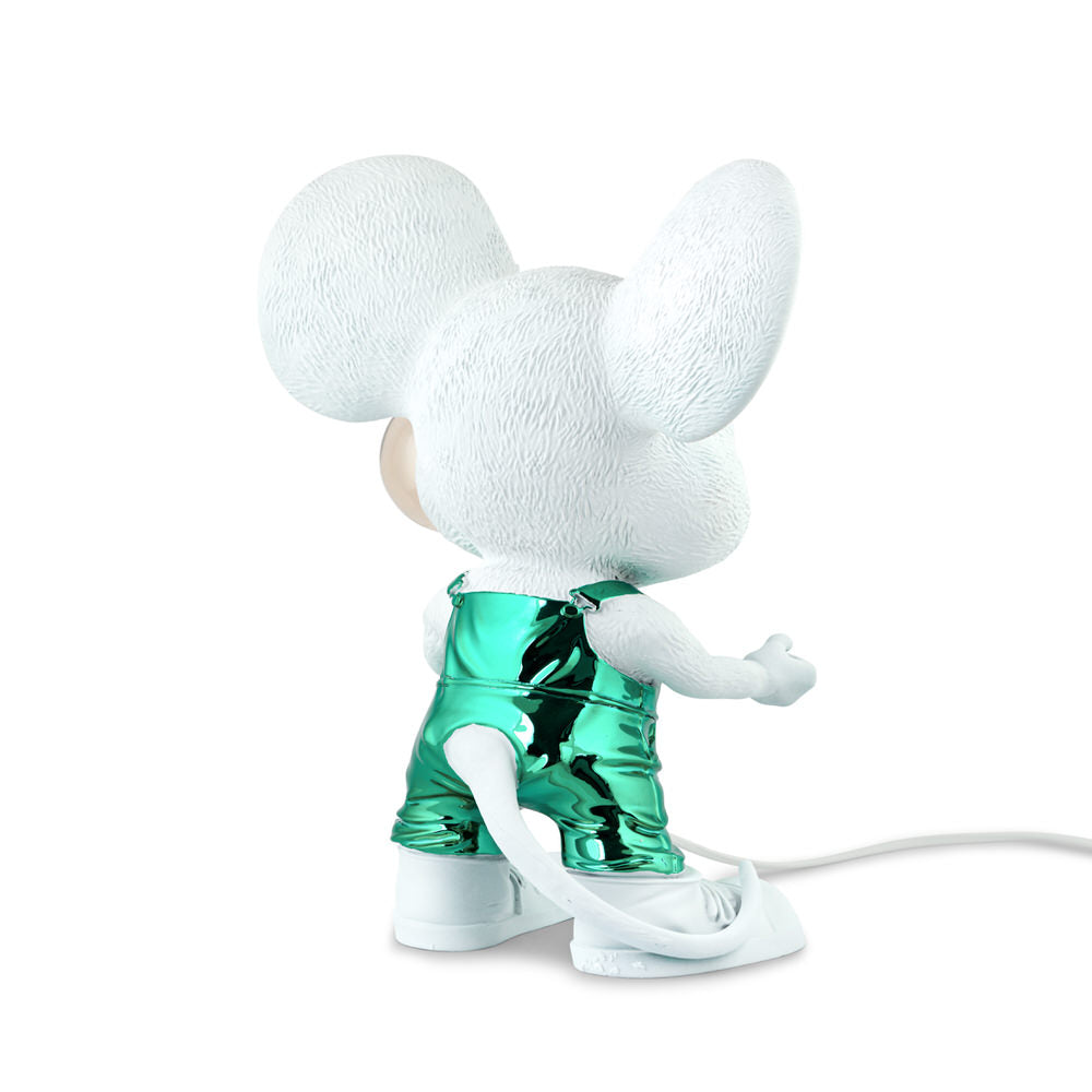 Realizzato in resina e polvere di marmo, con una finitura in bianco satinato e dettagli metallizzati verde smeraldo, questo topolino non passa inosservato.